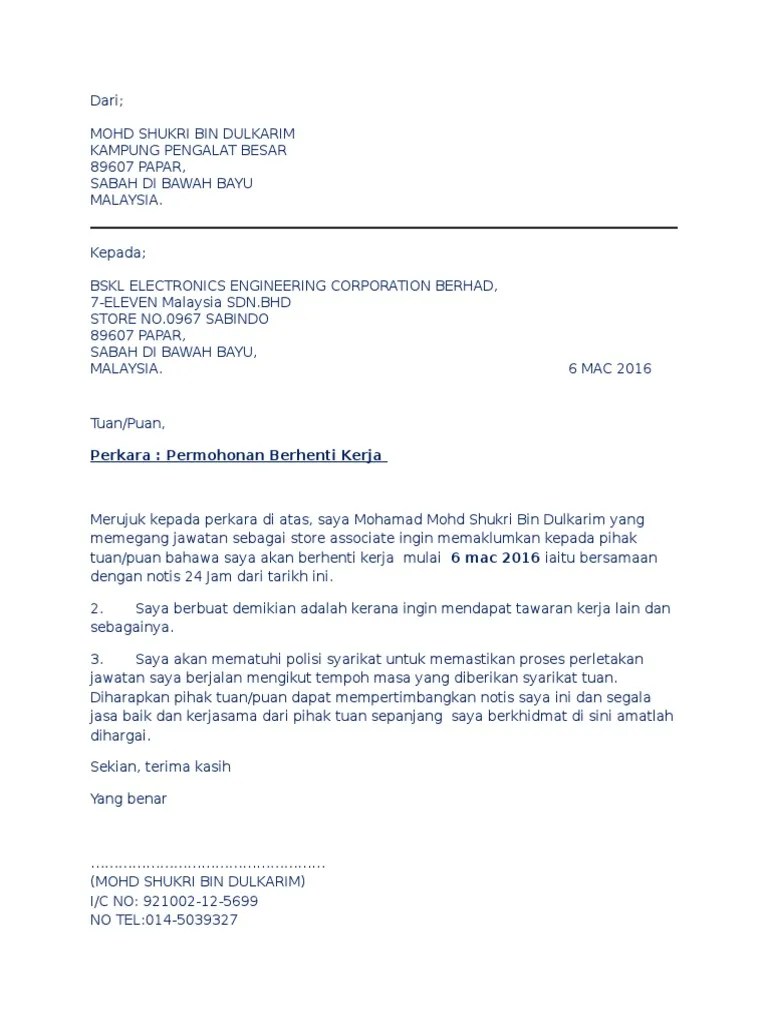 Contoh Surat Berhenti Kerja Yang Mudah Dan Ringkas Sesuai Untuk Semua from voize.my Di sini dikongsikan surat berhenti kerja yang mudah dan ringkas dalam bahasa melayu dan inggeris bagi notis perletakan jawatan sama ada 24 jam atau sebulan. Surat letak jawatan versi bahasa melayu. Merujuk kepada perkara di atas, saya ahmad farhan bin ahmad fuad, ingin memaklumkan kepada pihak tuan bahawa saya akan berhenti kerja mulai 31hb may 2010. Dengan segala hormatnya perkara di atas adalah dirujuk. Diharapkan pihak tuan dapat mempertimbangkan notis saya ini dan segala jasa baik dan kerjasama dari pihak tuan sepanjang saya berkhidmat di sini amatlah dihargai. Saya berbuat demikian adalah kerana ingin menyambung pelajaran. Untuk pengetahuan anda, ramai yang mencari contoh surat berhenti kerja 24 jam, sseminggu, sebulan. Surat berhenti kerja anda akan memudahkan peralihan selama dua minggu akan datang di tempat kerja, dan juga akan membantu anda mengekalkan hubungan positif dengan majikan anda walaupun selepas anda tidak lagi dengan syarikat.