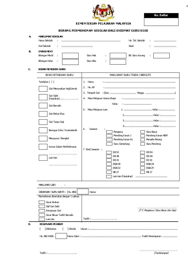 Ahmad rosydi bin ahmad basir, pen.ppd (pegawai khas kgsk) untuk pertanyaan lebih lanjut berkaitan perkara ini melalui Daftar kementerian pelajaran malaysia borang permohonan sekolah bagi khidmat guru kgsk a. Borang guru ganti sekolah nak ambil atau download kat mana? Permohonan jawatan guru ganti di bawah adalah dari jabatan pendidikan negeri perak. Sekiranya anda layak, sila download dan isi borang di bawah.