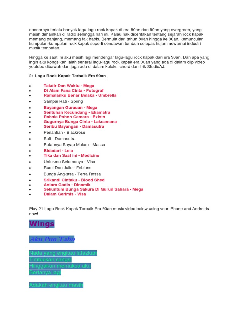 Lagu jiwang rock 90an mengamit memori. 9,624 likes · 2,542 talking about this. View senarai lagu jiwang yang best pictures senaraivlogs. Lagu jiwang sengsara inicio facebook. Tu dulu la, sekarang …. 28 senarai lagu rock kapak terbaik sepanjang zaman background senaraivlogs. Senarai lagu finalis anugerah juara lagu. Lagu jiwang slow rock popular terbaik malaysia 90anlagu slow rock jiwang popular3 terhebat kumpulan rock jiwangralat:mohon maaf kepada semua peminat lagu slo. 1) untukmu ibu 2) rahsia pohon cemara 3) langkah seiringan 4) janji padamu 5) alasanmu 6) masih terserlah ayumu 7) mengintai dari tirai kamar 8) hani lempengnya hangus 9) kapal terbang kertas 10) dirantai digelangi rindu 11) bunga 12) jesnita 13) mama tolonglah percaya 14) julia Lagu jiwang rock 90an mengamit memori. So,aku wat la research kat u tube. 2 cd dalam 1 harga yang menampilkan rahmat ekamatra, arrow, mamat exist, slam, spin, okay, kasawari, versi, rio, twin, qiara, terrarosa dan ramai lagi. Thomas arya ~ miss teasing memories (new song 2019) layns guys song across 🎸🎶🤙🤟👍.